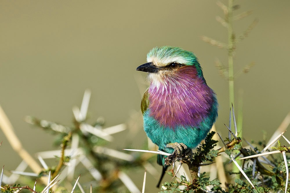 In addition to mammals, the feathered inhabitants of the savanna are always nice too. The Lilac-breasted Roller poses in the sun and a Crowned Crane feeds in the immediate vicinity without fear.